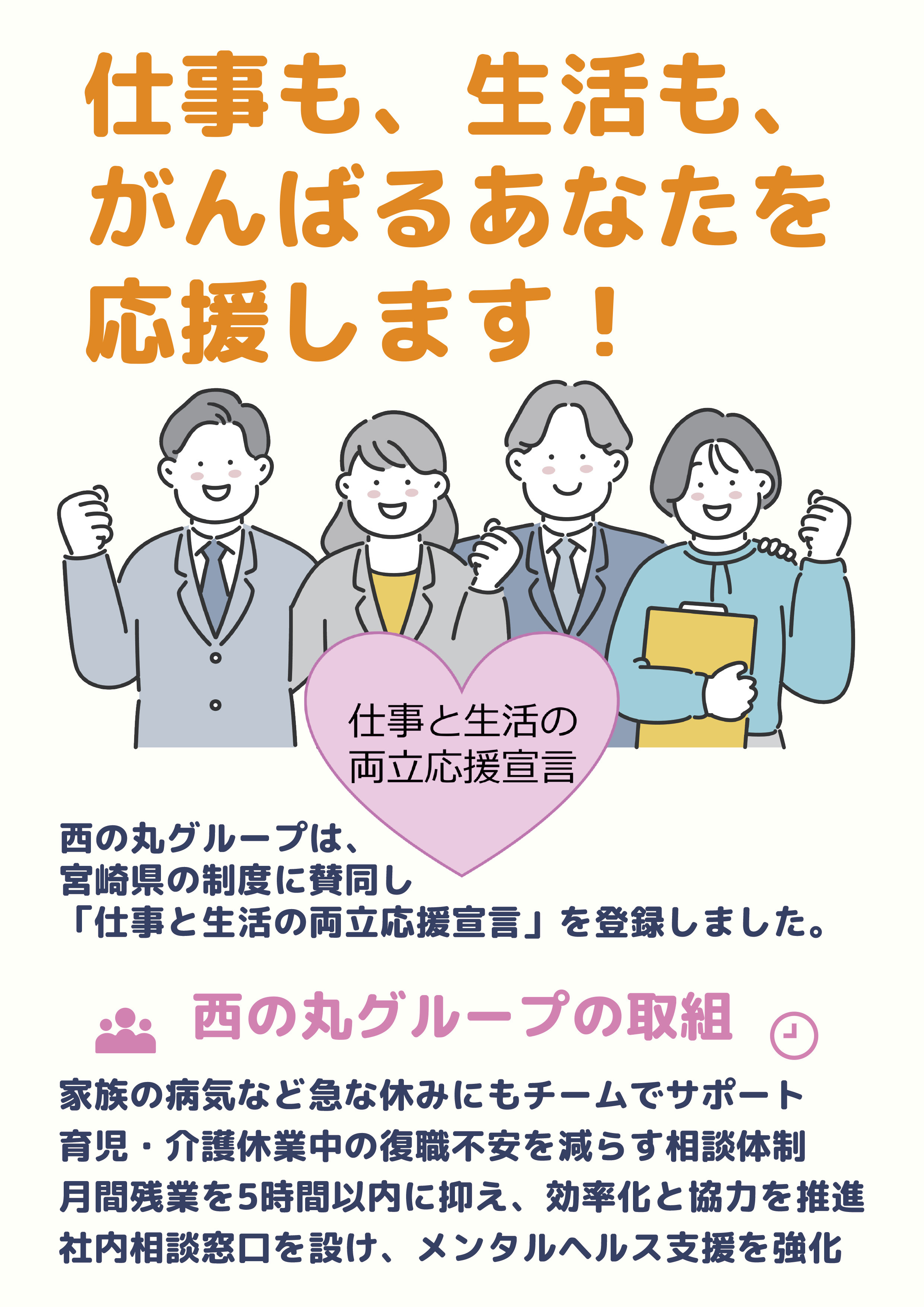 西の丸グループは、宮崎県の制度に賛同し「仕事と生活の両立応援宣言」を登録しました。