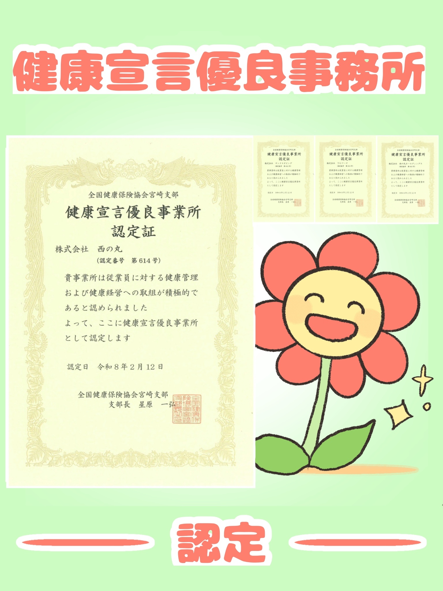 西の丸グループの4社が、このたび「健康宣言優良事業所」に認定されました。